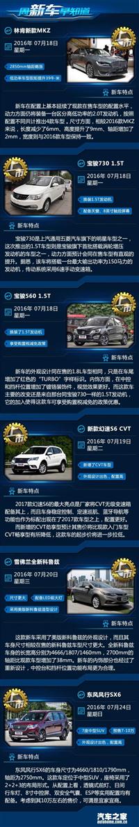 全新科鲁兹/林肯MKZ等 一周新车早知道 车天下汽车网 发表于:2016-07-17 08:31 [车天下新闻]又是星期天啦!当您点开这篇文章时,我们又将和您一同迎来了一个新的开始,新的一周我们将迎来哪些令人期待的事情呢?下周都有什么上市新车呢,你不知道?读完你就早知道!本期的《一周新车早知道》栏目中您将看到林肯新款mkz、雪佛兰全新科鲁兹以及搭载1.5t发动机的宝骏560以及宝骏730等新车。 -