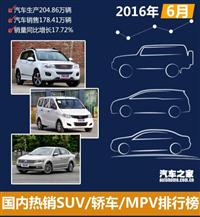 2016年6月国内热销SUV/轿车/MPV排行榜 车天下汽车网 发表于:2016-07-11 04:32 [车天下销量风云榜]日前,中国汽车工业协会正式发布了2016年6月的全国汽车工业报告,其中2016年6月的国内热销suv、轿车、mpv车型的排行榜也被公布出来。