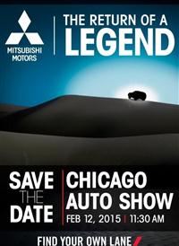 推“传奇”车型 三菱芝加哥车展预告图 车天下汽车网 发表于:2015-01-23 11:32 [车天下新闻]2015芝加哥车展将于当地时间2月12日正式开幕,日前三菱官方发布了一张车展预告海报,从海报的内容当中我们注意到,三菱或将在本届车展上发布一款“传奇”车型。 -